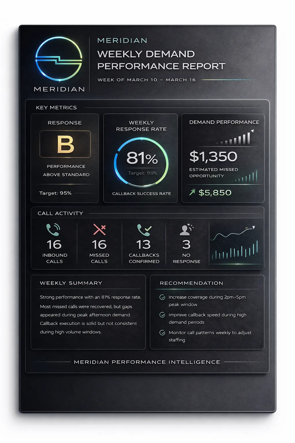 See how Meridian turns missed calls, callbacks, and demand response performance into a clear weekly snapshot.